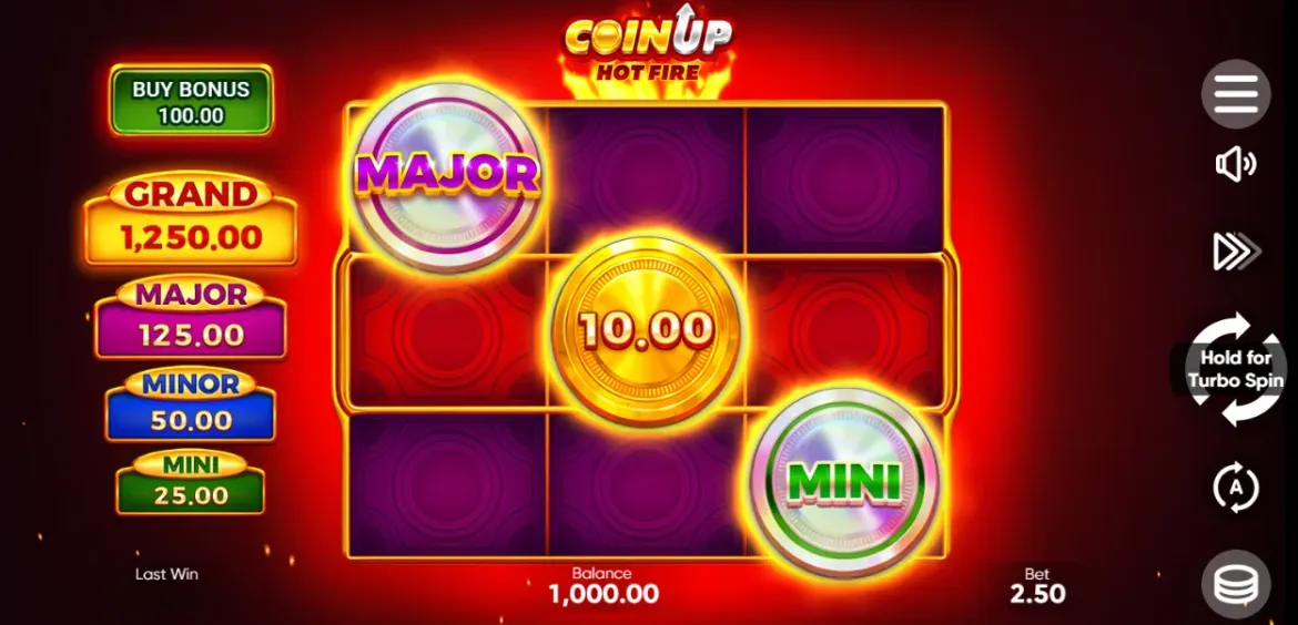 Coin Up: Hot Fire features four fixed jackpots that players can win during the bonus round. The Mini, Minor, and Major jackpots offer multipliers of 10x, 20x, and 50x the stake, respectively. The ultimate prize is the Grand Jackpot, which awards up to 500x your bet and is triggered by filling all nine positions on the reels with bonus symbols during the Hold & Win feature. The jackpots add a compelling target for players, combining the excitement of chasing big wins with the strategic gameplay of the respin mechanic. This tiered jackpot system ensures that every spin in the bonus round carries the potential for a rewarding payout, keeping the gameplay engaging and rewarding.